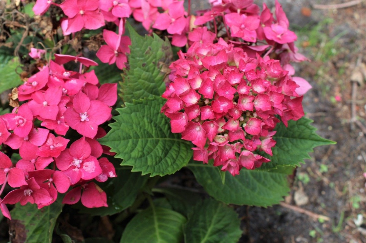Ремонтантный сорт. Цветки красно-вишнёвые в щелочной почве и фиолетово-синие в кислой. Сорт 'Leuchtfeuer' - невысокий кустарник до1 м. Цветки от карминово-красных до бордовых оттенков. Очень эффектные. Соцветия округлые, крупные. Цветёт июнь-август. Устойчива к заболеваниям, зимостойкость-средняя. Кустарник высотой 1 – 2м. При выращивании в контейнерах имеет высоту 0.4 – 0.6м.