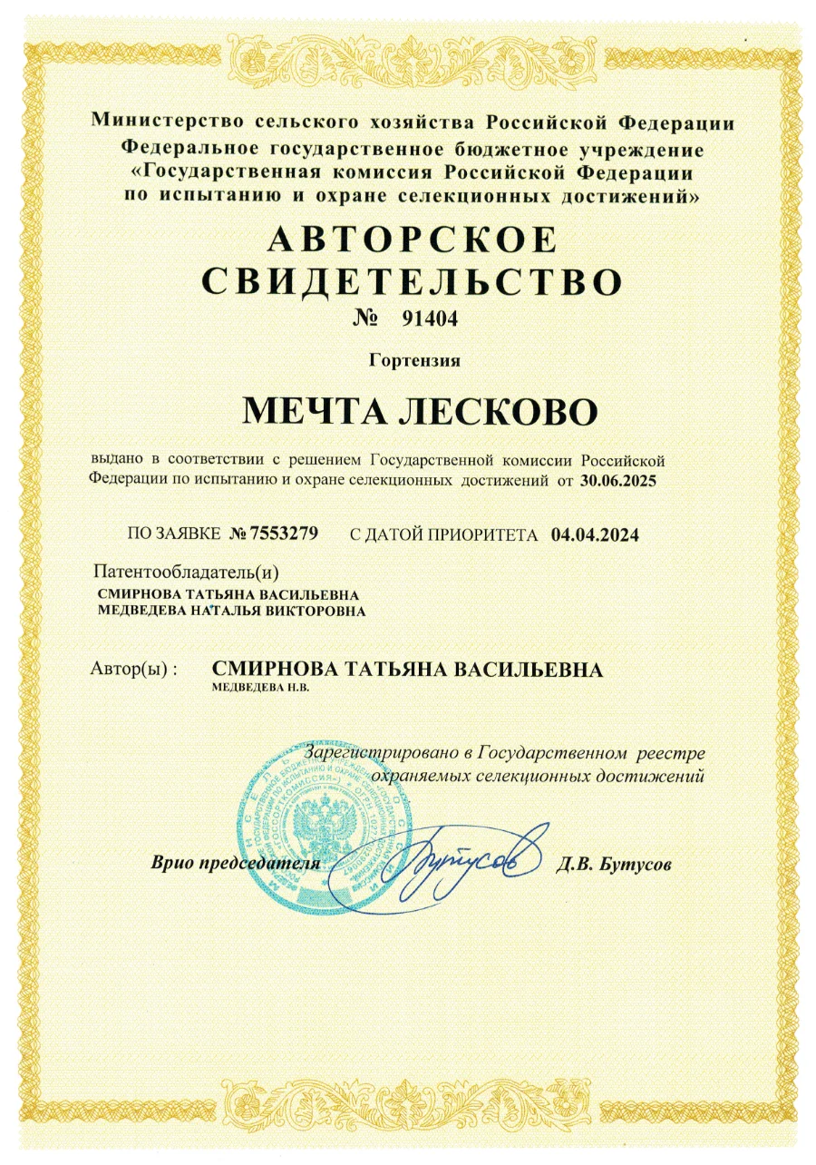 Первый в мире сорт метельчатой гортензии с махровыми цветами! Компактный куст, высотой 40 см, и к 4-5 годам может достигать 50-60 см. Соцветие размером 15-20 см. Состоит из стерильных махровых цветков. Цветение начинается с середины июля и продолжается до середины октября. В начале цветения имеет оттенки палево-зеленого, затем появляется розовая кайма, которая постепенно заполняет весь лепесток, но серединка долго остается светло-зеленой. Сорт устойчивый к болезням и вредителям, зимо - и морозостойкость хорошая, до – 32 градусов, не требует укрытия на зиму. Внимание! Сорт «Мечта Лесково» охраняемый сорт, все права на продажу и размножение принадлежит питомнику Лесково! Остерегайтесь подделок, их сейчас очень много.