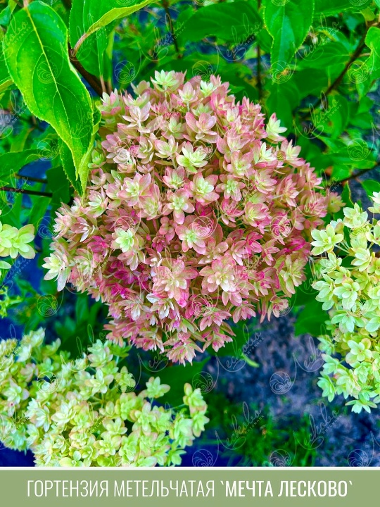 Первый в мире сорт метельчатой гортензии с махровыми цветами! Компактный куст, высотой 40 см, и к 4-5 годам может достигать 50-60 см. Соцветие размером 15-20 см. Состоит из стерильных махровых цветков. Цветение начинается с середины июля и продолжается до середины октября. В начале цветения имеет оттенки палево-зеленого, затем появляется розовая кайма, которая постепенно заполняет весь лепесток, но серединка долго остается светло-зеленой. Сорт устойчивый к болезням и вредителям, зимо - и морозостойкость хорошая, до – 32 градусов, не требует укрытия на зиму. Внимание! Сорт «Мечта Лесково» охраняемый сорт, все права на продажу и размножение принадлежит питомнику Лесково! Остерегайтесь подделок, их сейчас очень много.